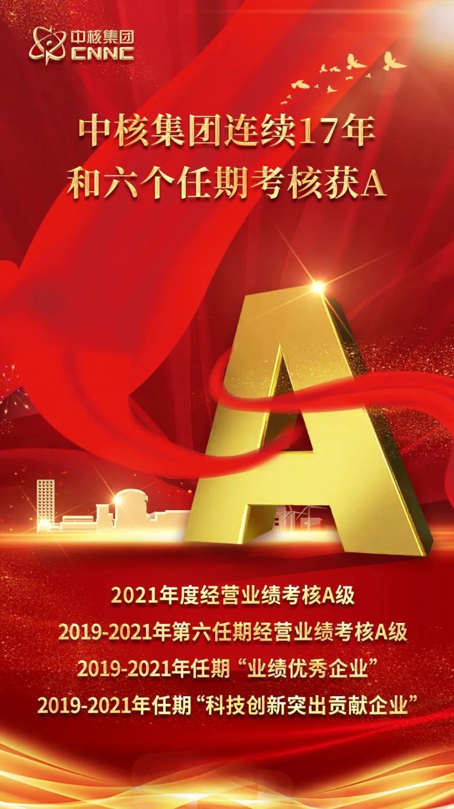 中核集團榮獲2021年度考核A級、2019-2021年第六任期考核A級,這是中核集團連續17年和六個任期考核A級。同時,中核集團還榮獲2019-2021年任期“業績優秀企業”、“科技創新突出貢獻企業”兩項榮譽。