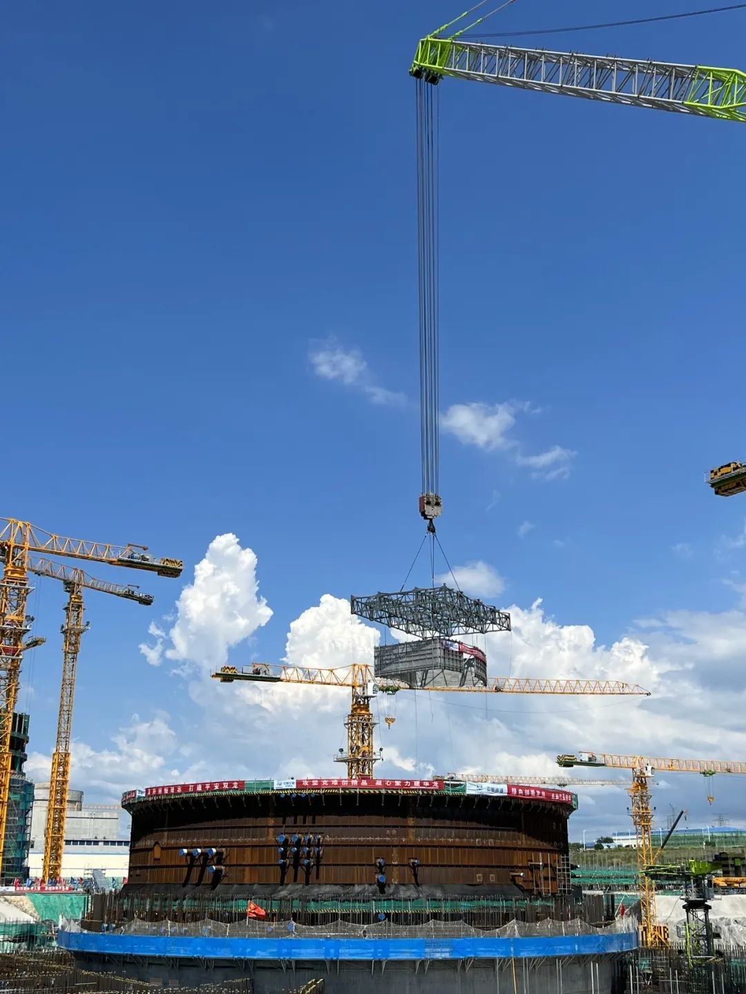 2022年7月23日15時41分,在歷經3天的艱苦奮戰后,海南昌江核電4號機組核島廠房內置換料水箱第三個模塊穩穩地就位在基礎上,至此R141~R143房間模塊整體全部吊裝完成,提前三級進度計劃28天完成MKJ考核點。本次吊裝標志著4號機組核島廠房不銹鋼水池施工正式拉開序幕。
