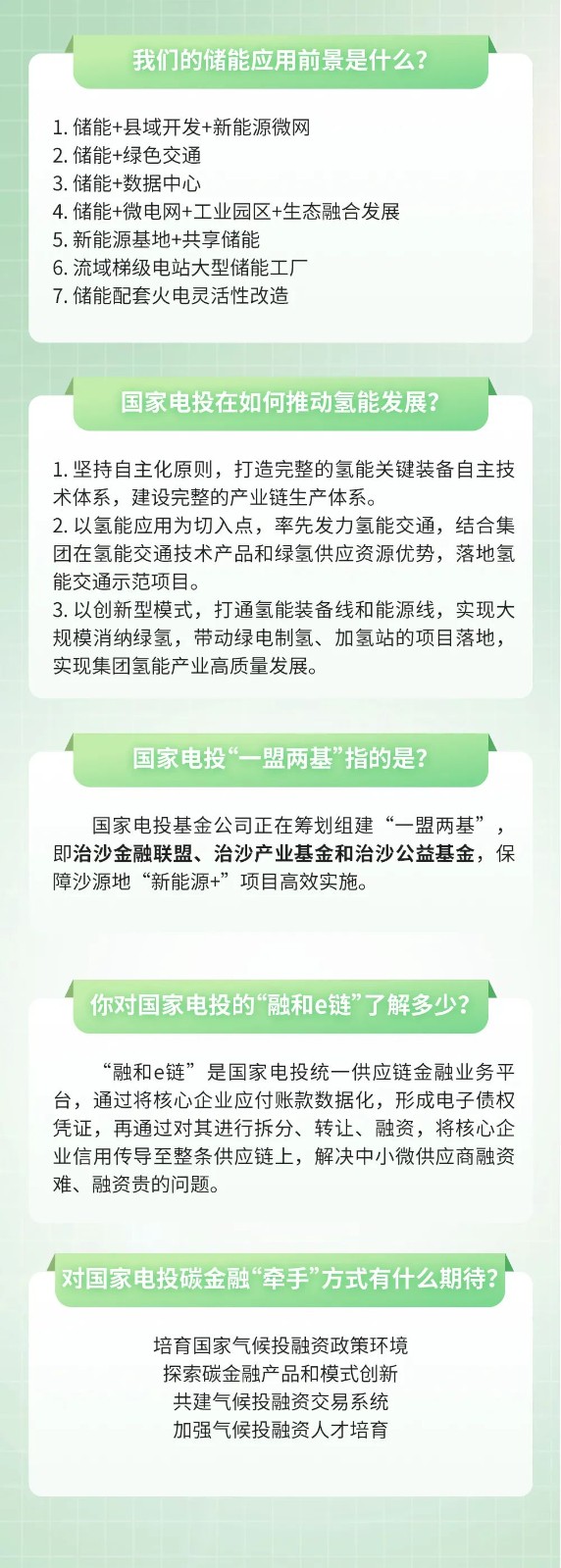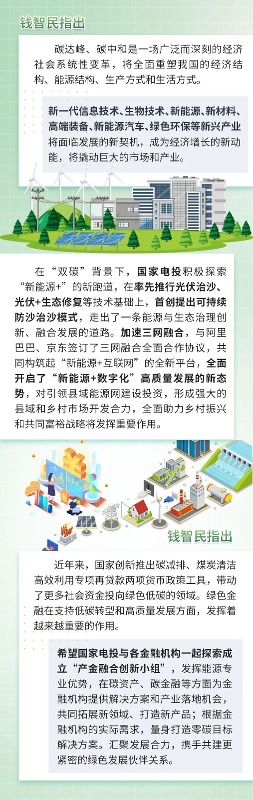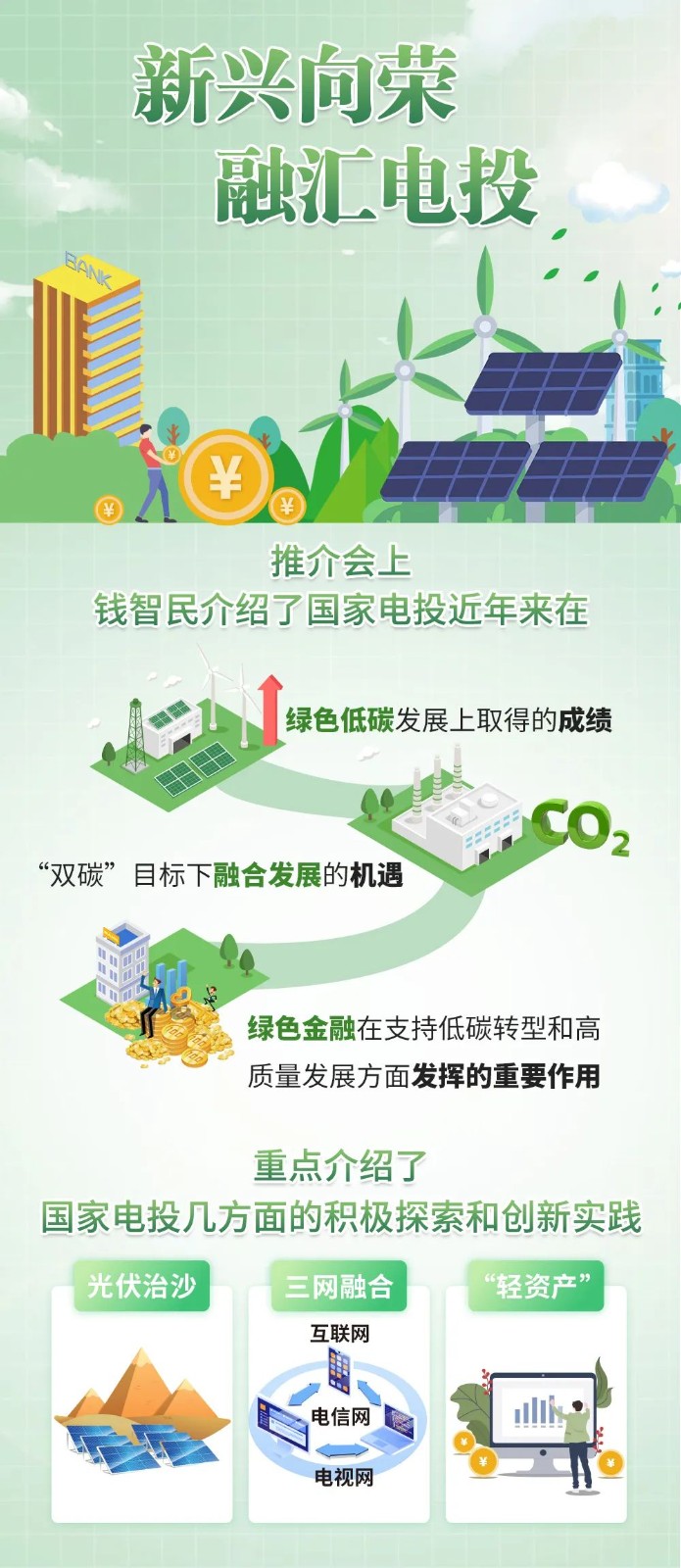 錢智民介紹道,國家電投作為我國唯一擁有核電、火電、水電、風電、光伏發電、生物質發電等全部發電類型的能源企業,深入踐行習近平總書記關于清潔低碳發展的重要指示批示精神,以“創造綠色價值”為使命,以“綠色 創新 融合,真信 真干 真成”為核心價值觀,制定了面向新時代的“2035一流戰略”,在綠色低碳發展上取得了顯著成效。目前,國家電投裝機總規模已突破2億千瓦,新能源發電裝機量、可再生能源發電裝機量、清潔能源發電裝機量均居世界第一。他表示,在全球能源結構向非化石能源轉型的進程中,把握“風光無限”的未來機遇取決于新能源技術創新,更取決于金融。我們愿與金融企業共同發力,為實現中國能源清潔低碳轉型貢獻更大力量。