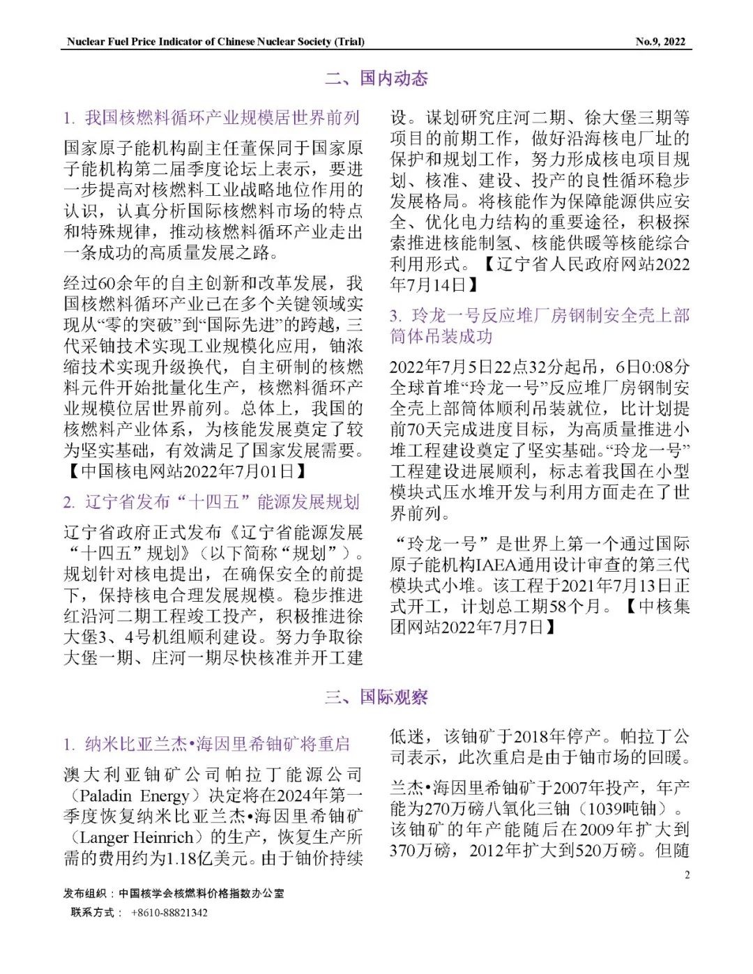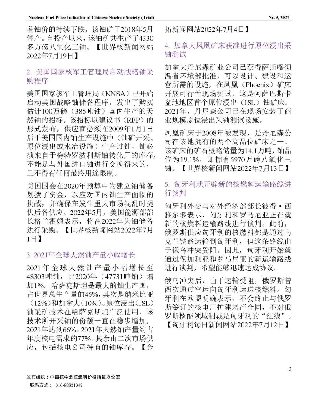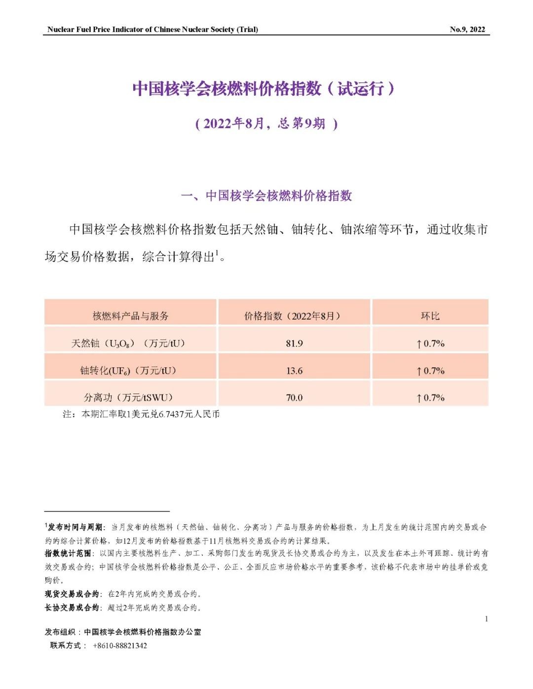 中國核學會核燃料價格指數(試運行)2022年8月