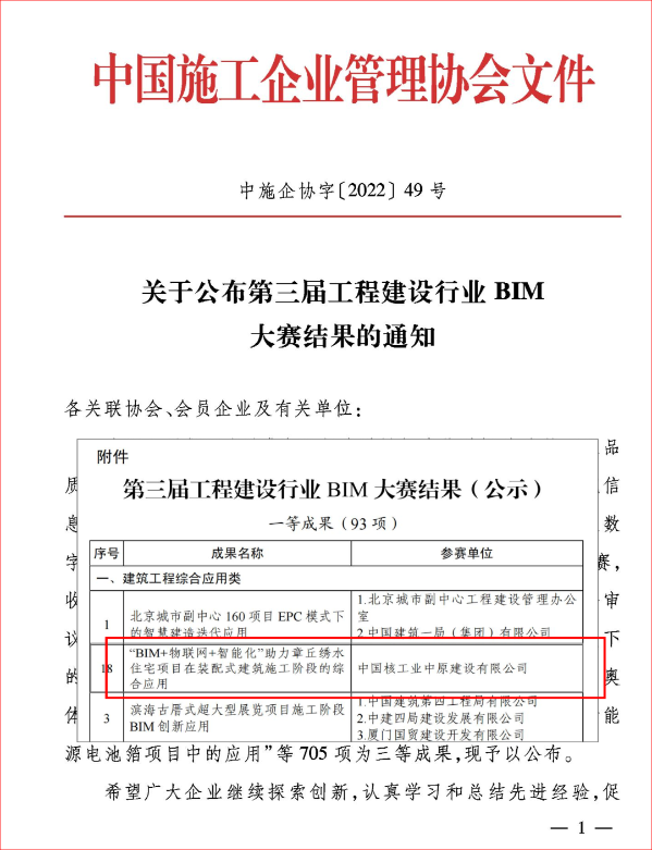 近日,中國(guó)施工企業(yè)管理協(xié)會(huì)“第三屆工程建設(shè)行業(yè)BIM大賽”公布獲獎(jiǎng)名單,中核中原建設(shè)《“BIM+物聯(lián)網(wǎng)+智能化”助力章丘繡水住宅項(xiàng)目在裝配式建筑施工階段的綜合應(yīng)用》獲建筑綜合應(yīng)用類(lèi)一等獎(jiǎng),為集團(tuán)公司在該組別獲得的最高榮譽(yù)。