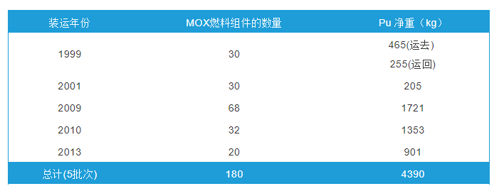 1999年和2001年,裝運(yùn)的燃料中包含60個MOX燃料組件,用于東京電力公司的福島核電站1-3號機(jī)組和柏崎刈羽核電站3號沸水堆機(jī)組,以及關(guān)西的高濱核電站4號機(jī)組。