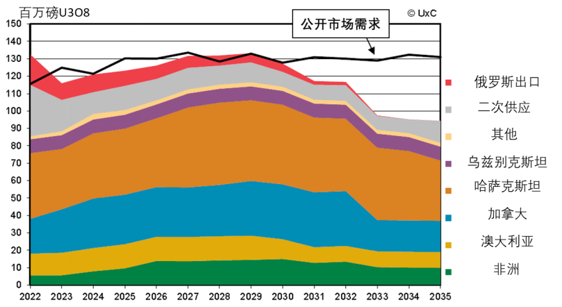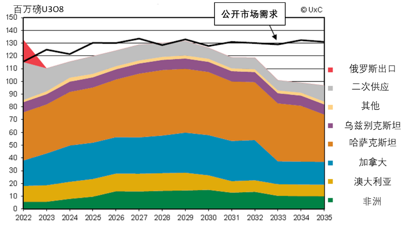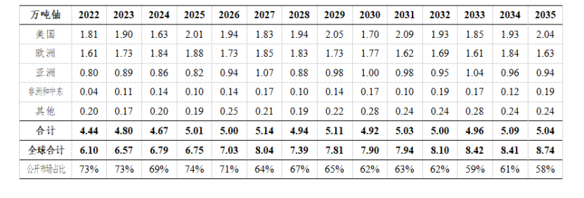 上表中的國家/地區(qū)占2022年全球鈾市場總需求的約73%。不過隨著中國、俄羅斯以及依賴中、俄設(shè)計的核電機組的國家持續(xù)發(fā)展核電,且一些公開市場的國家/地區(qū)核電裝機逐漸減少,預(yù)計到2030年左右,公開市場的鈾需求占全球份額將下降至62%,到2035年將進一步下降至58%(見下表)。