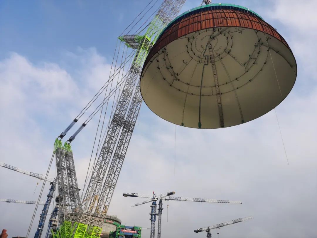 內(nèi)穹頂?shù)跹b是華龍一號(hào)核電工程建設(shè)的重要里程碑。穹頂位于核島頂部,主要功能是保證反應(yīng)堆廠(chǎng)房完整性和密封性,對(duì)放射性包容起關(guān)鍵性作用。吊裝當(dāng)天,隨著總指揮一聲令下,內(nèi)穹頂被緩緩吊離地面,經(jīng)過(guò)起鉤、變幅、提升、帶載行走、大臂逆時(shí)針回轉(zhuǎn)等一系列高精度動(dòng)作,精準(zhǔn)直達(dá)漳州核電2號(hào)機(jī)組反應(yīng)堆廠(chǎng)房上方,隨后緩慢下降,經(jīng)調(diào)整無(wú)誤后,平穩(wěn)落鉤就位在安全殼鋼襯里上。