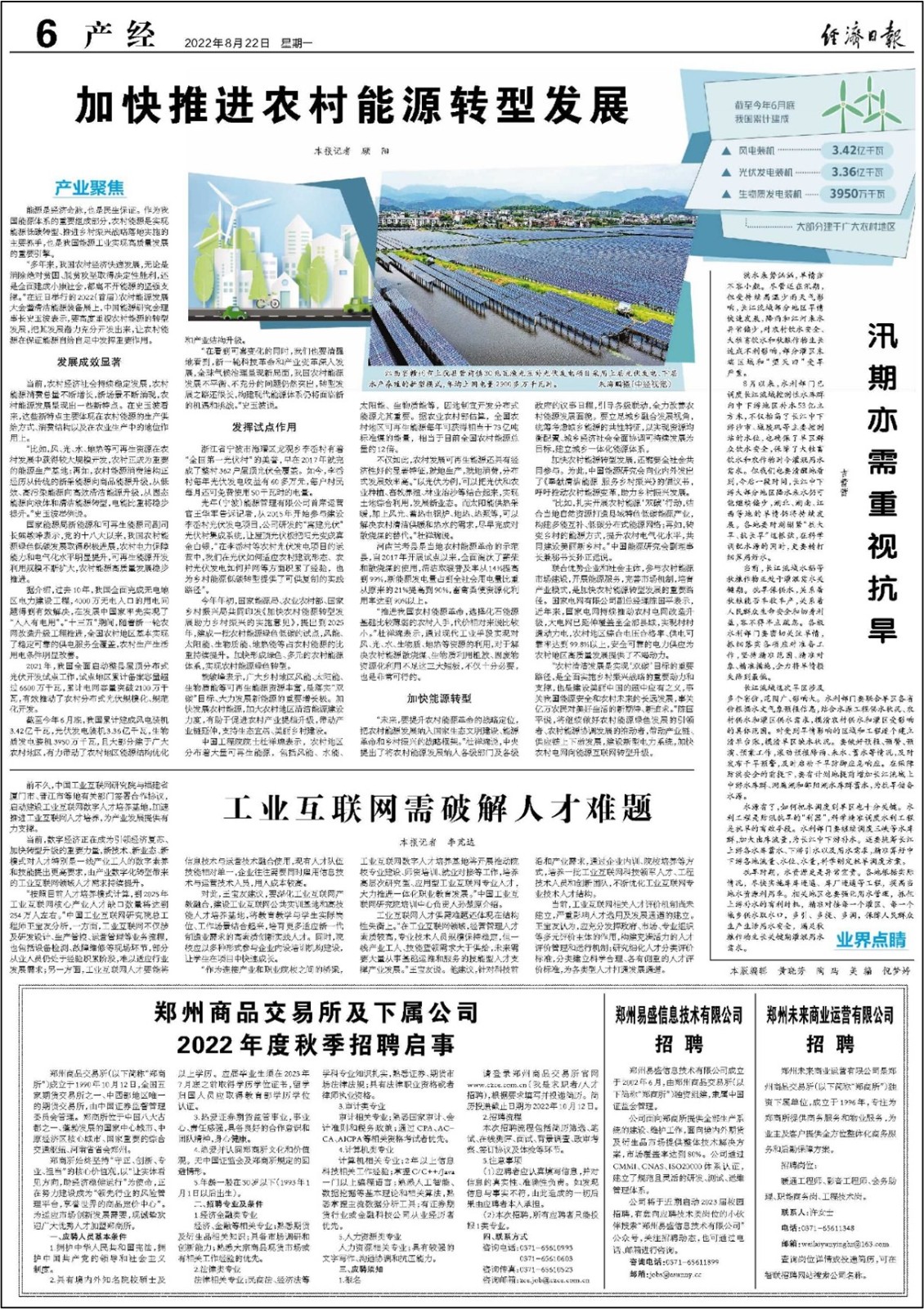 8月22日,由國務(wù)院主辦的經(jīng)濟日報在產(chǎn)經(jīng)版頭條刊發(fā)了題為《加快推進農(nóng)村能源轉(zhuǎn)型發(fā)展》的專題報道,報道了大會的成功召開以及重要領(lǐng)導(dǎo)、嘉賓的部分發(fā)言和演講。文中提到,當(dāng)前農(nóng)村能源發(fā)展成效顯著,要發(fā)揮新能源和可再生能源重要項目、重要村縣的示范試點帶頭引領(lǐng)作用,要加快能源轉(zhuǎn)型發(fā)展,促進全面實施鄉(xiāng)村振興戰(zhàn)略和建設(shè)美麗中國貢獻力量。