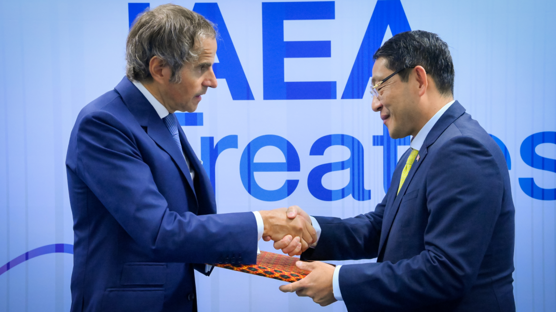 國際原子能機構總干事拉斐爾·格羅西和柬埔寨王國礦業和能源部國務秘書翁英。(照片:D. Calma/IAEA)柬埔寨王國礦產和能源部國務秘書翁英交存了《核事故或輻射緊急情況援助公約》的加入書。