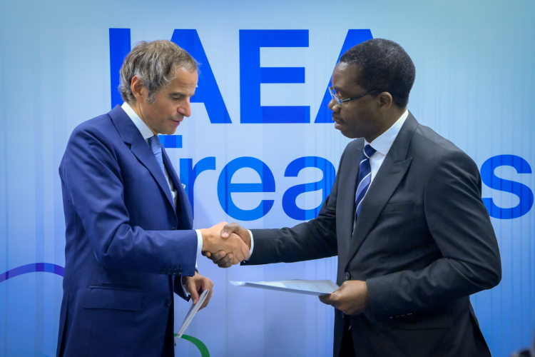 國際原子能機構總干事拉斐爾·格羅西和毛里塔尼亞大使穆罕默德·馬哈茂德·布拉欣·哈利勒。(照片:D. Calma/IAEA)毛里塔尼亞大使 Mohamed Mahmoud Brahim Khlil 交存了一份接受《非洲核科學技術研究、發展和培訓地區合作協定》(AFRA)的文書。