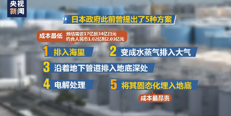 在這5種方案中,將核污染水排入海里是成本最低的,預估需要17億到34億日元,約合人民幣1.02億到2.03億元;而最昂貴的辦法是將其固態化埋入地底,預估其成本是排放入海的幾十倍甚至上百倍。