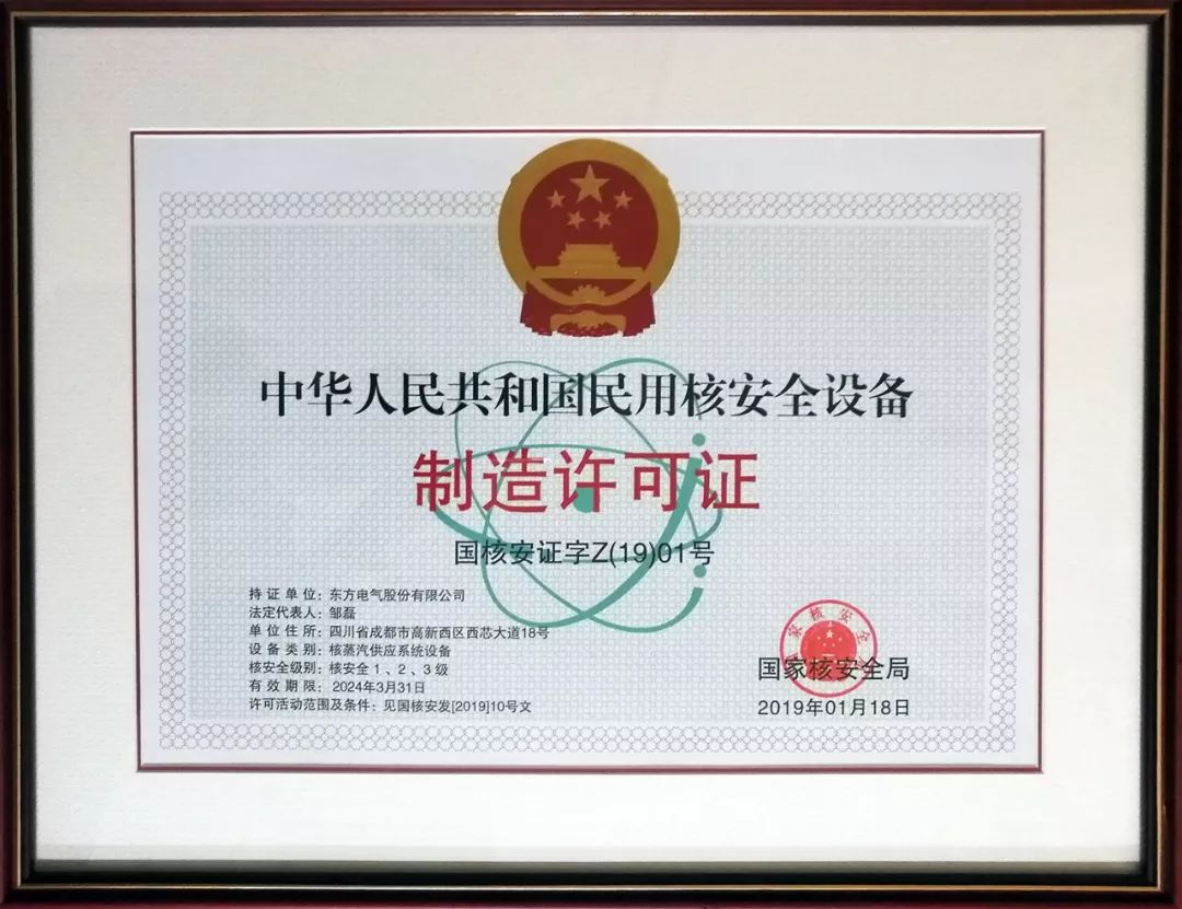 構建核電完整產業鏈,打造核電設備成套供貨能力是東方電氣人的矢志追求。2019年1月21日,國家核安全局向東方電氣集團頒發了全國首張核蒸汽供應系統設備制造許可證,標志著東方電氣集團成為國內首家具有核蒸汽供應系統設備成套供貨資質的裝備制造集團。至此,經過十年努力、五年試點,東方電氣核蒸汽供應系統設備成套供貨許可取證工作圓滿完成。東方電氣集團以此為新起點,充分發揮成套供貨優勢,嚴格遵守核安全法規,切實強化核安全文化意識,不斷優化管理模式,持續設計制造能力和水平。