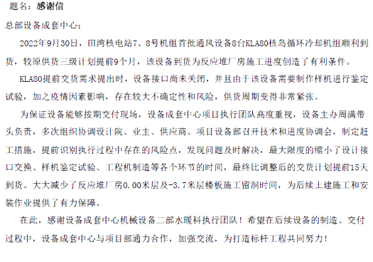 2022年4月30日樣機順利完工,5月26日工程機制造開工,9月27日工程機出廠驗收,9月30日設備運抵田灣現場,水暖團隊緊鑼密鼓地推動設備制造進展,不僅圓滿完成了看似不可能完成的任務,更在此基礎上搶出了15天的時間,這大大減少了反應堆廠房0.00米層及-3.7米層樓板施工留洞時間,為后續土建施工和安裝作業提供了有力保障,設備成套中心也收到了項目部發來的感謝信。