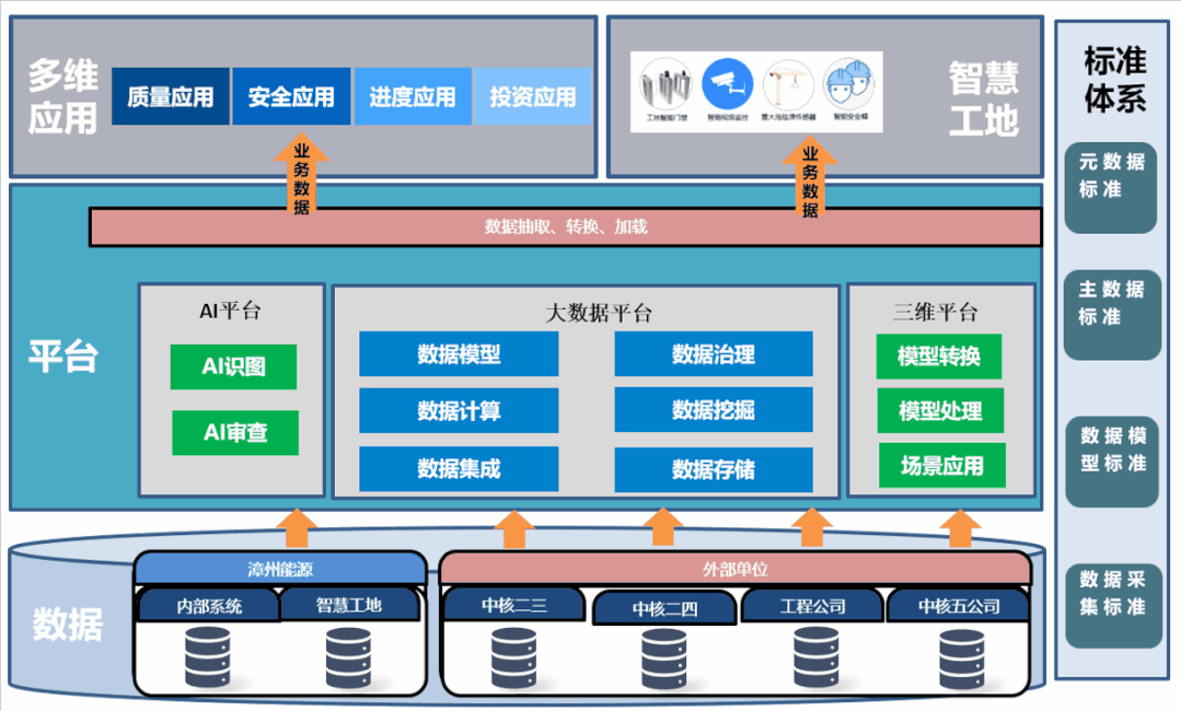 核電施工大數據平臺以漳州能源實際業務需求為主,梳理核電施工領域數據建立相關標準規范,基于大數據、人工智能等先進信息技術,實現施工領域的安全、質量、投資、進度、典型設備制造等業務指標數據統計分析、可視化展示、分析應用場景、趨勢分析、決策支持,同時為智慧工地項目及后續機組建設、運行提供大數據應用支撐,滿足工信部試點示范要求,賦能“六大控制七個零”筑基立桿精細化實施工程。