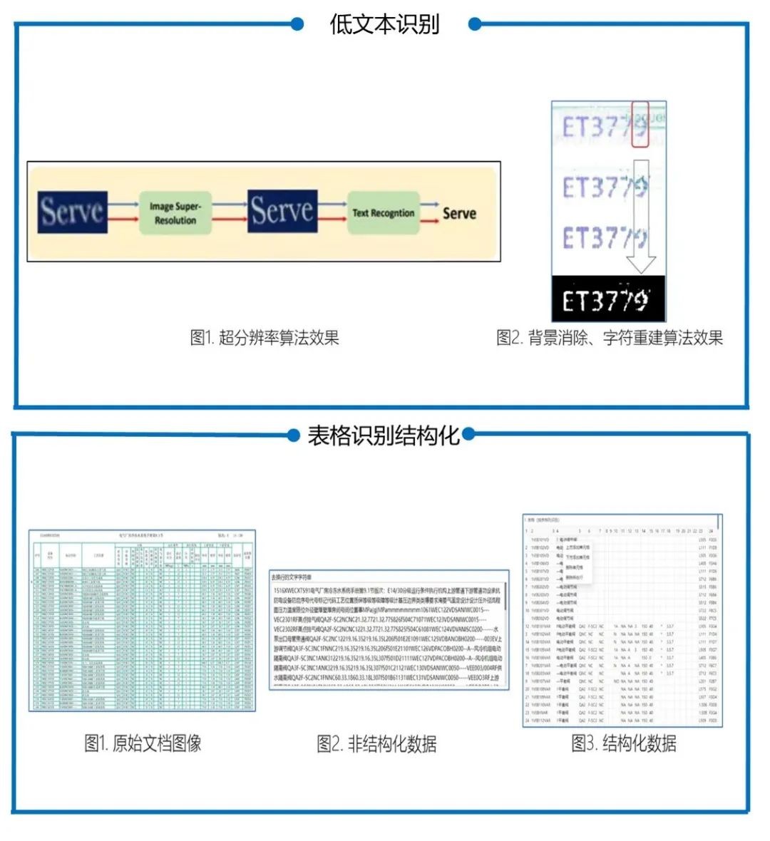 施工大數據平臺將分布在不同異構系統的結構化、非結構化、實時數據通過大數據平臺數據治理形成各業務領域數據資產。在非結構化數據的治理過程中,傳統的OCR技術在面對各類復雜識別場景時,存在文檔照片成像質量模糊、文本布局存在透視變形等干擾因素,導致識別準確率與簡單識別場景落差較大。通過結合AI的超分辨率、背景消除及字符重建算法,低質文本得以修復,最終提高識別準確率;而對于表格類文檔,市面上通用的OCR技術只獲取到非結構化的一維數據,此類數據已經丟失文檔中的表格信息,對于后期數據的使用十分不利。經過表格檢測、結構化識別后,最終可獲取到同為表格分布的結構化數據,可用于各類場景。
