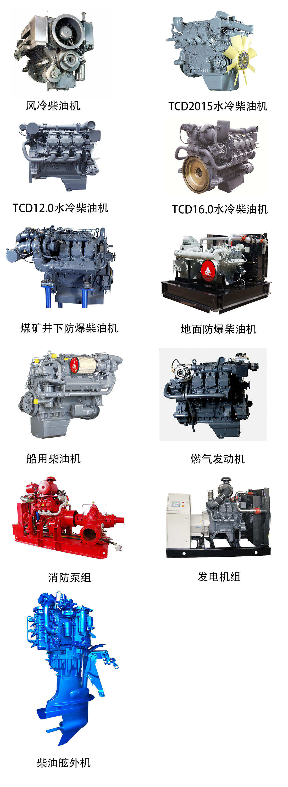 公司產品包括引進德國道依茨技術生產的B/FL413F/513系列風冷發動機和BFM1015系列、TCD2015系列、TCD12.0/16.0系列水冷發動機,自主研制的6V/8V/12V/16V132系列發動機、防爆發動機、船用發動機、燃氣發動機、甲醇發動機、豎軸舷外機等。廣泛應用于工程機械、發電機組、石油設備、核電裝備、特種車輛、船用設備、載重汽車、豪華客車、應急救援等領域,并已批量出口德國、俄羅斯、印度、馬來西亞、伊朗、土耳其、津巴布韋、黎巴嫩等十余個國家和地區。
