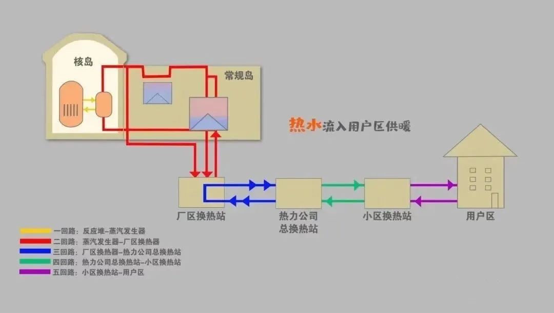 核能供暖的原理是將核電廠產(chǎn)生的部分熱量傳遞給熱力公司,再經(jīng)過(guò)供熱管網(wǎng)送至終端用戶。這個(gè)過(guò)程由五個(gè)回路完成,首先一回路核反應(yīng)產(chǎn)生的熱量通過(guò)蒸汽發(fā)生器將二回路的水加熱產(chǎn)生高溫高壓蒸汽,通過(guò)抽取部分蒸汽加熱核電廠內(nèi)換熱站的水,加熱后的水經(jīng)過(guò)三回路管網(wǎng),傳送至熱力公司換熱站,依次加熱四、五回路供熱管網(wǎng)內(nèi)的水,從而實(shí)現(xiàn)將核電廠產(chǎn)生的熱量,安全地送入千家萬(wàn)戶進(jìn)行集中供暖的目的。