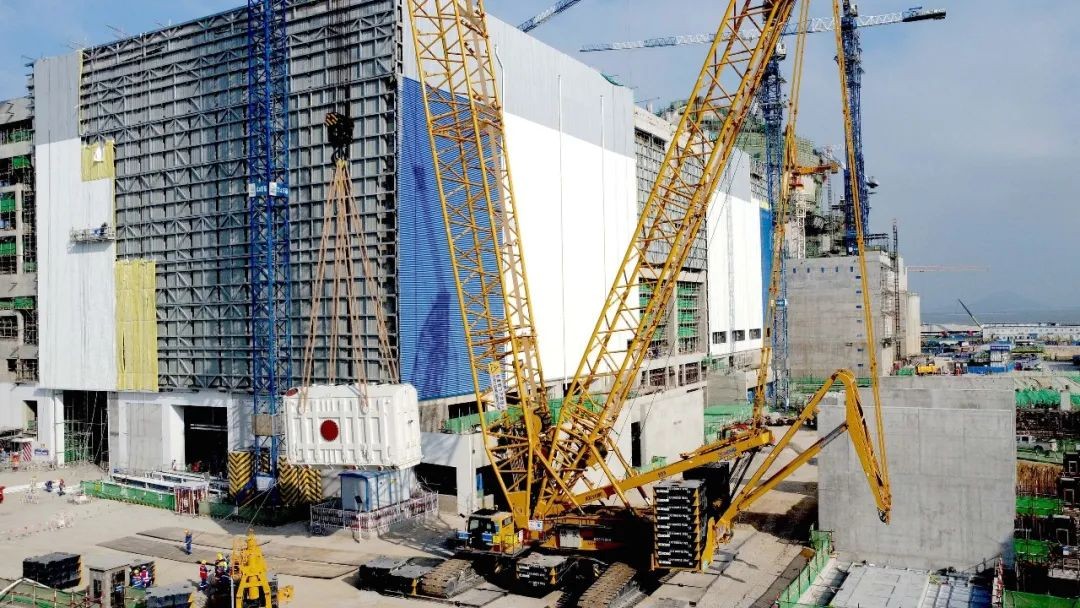 針對主、廠變壓器吊裝,中核工程漳州項目部提前一個多月組織各方精心策劃、周密籌備:采用BIM等技術推演吊裝過程,預判吊裝風險;通過“靈活走位”,不斷調整吊裝方向以確保精準就位。最終歷時5天,圓滿完成此次任務。