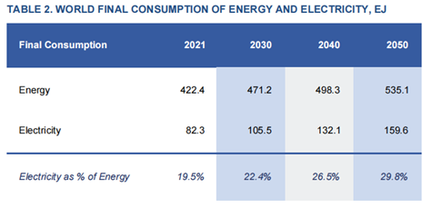 全球總發(fā)電量將從2021年的27萬(wàn)億千瓦時(shí)增至2030年33.3萬(wàn)億千瓦時(shí)、2040年41.5萬(wàn)億千瓦時(shí)和2050年50.1萬(wàn)億千瓦時(shí)。