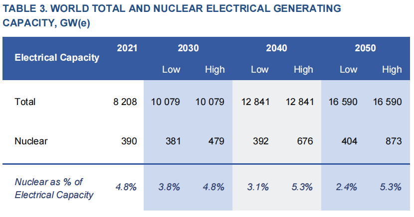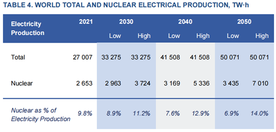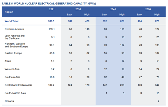 高值情景中,全球核電裝機(jī)容量將從2021年3.9億千瓦增至2030年4.8億千瓦、2040年6.8億千瓦和2050年8.7億千瓦;2021年、2030年、2040年和2050年核電容量在總電力裝機(jī)容量中所占份額分別為4.8%、4.8%、5.3%和5.3%。