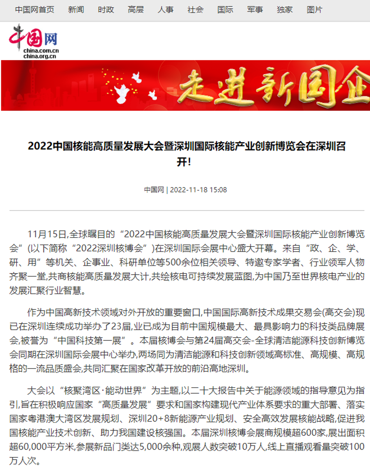 會后,國家能源局官網報道和宣傳了本屆深圳核博會的盛況,并予以高度評價。