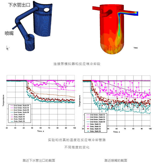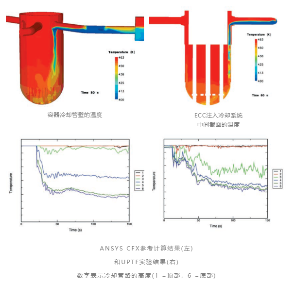 【案例描述】:堆芯冷卻時緊急注入冷水發(fā)生的壓熱沖擊威脅反應堆壓力容器壽命,當冷水與壓力容器壁接觸時,可能會導致較大的溫度梯度,從而導致容器壁的高應力。利用Ansys CFX軟件對冷卻管路的復雜湍流混合分層現(xiàn)象進行了準確預測。冷卻管路的最低溫度是決定熱沖擊嚴重程度的重要因素,其計算值與實驗值誤差在3%以內。