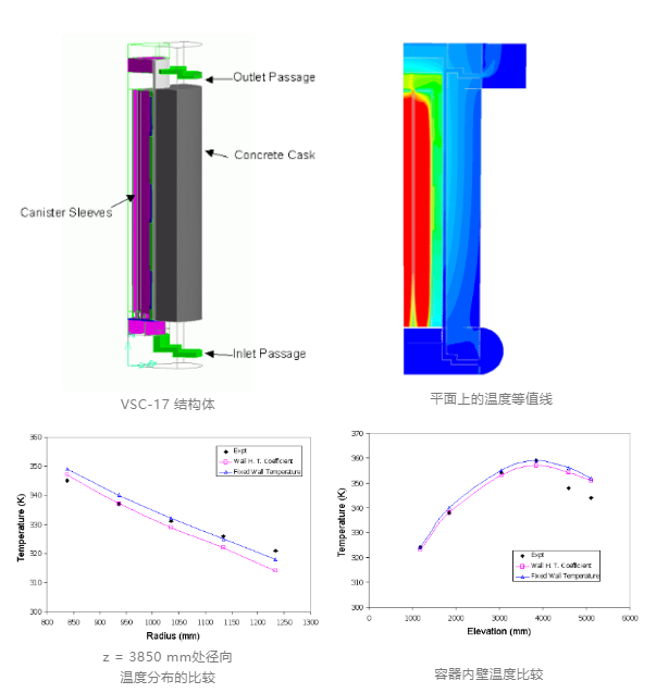 【案例描述】:通過ANSYS Fluent對用于乏燃料儲存和運輸?shù)腣SC-17系統(tǒng)的傳熱性能建模,燃料棒產(chǎn)生的熱量通過自然對流流動傳遞,計算溫度值和實驗溫度值一致性良好。