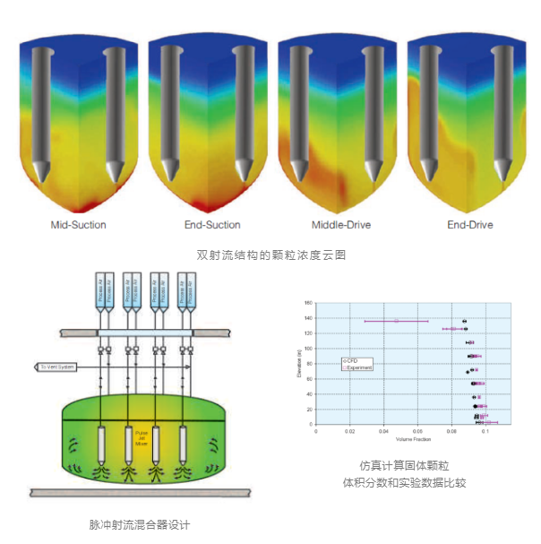 【案例描述】:通過Ansys Fluent歐拉顆粒多相模型預測固體分布,自定義函數(shù)控制瞬態(tài)邊界條件,并跟隨固體濃度在噴嘴內流動,對比仿真與實驗結果:發(fā)現(xiàn)CFD模擬預測的濃度略低于在較低海拔的實驗,但兩者非常接近,說明CFD模擬足以評定脈沖射流混合器的性能。