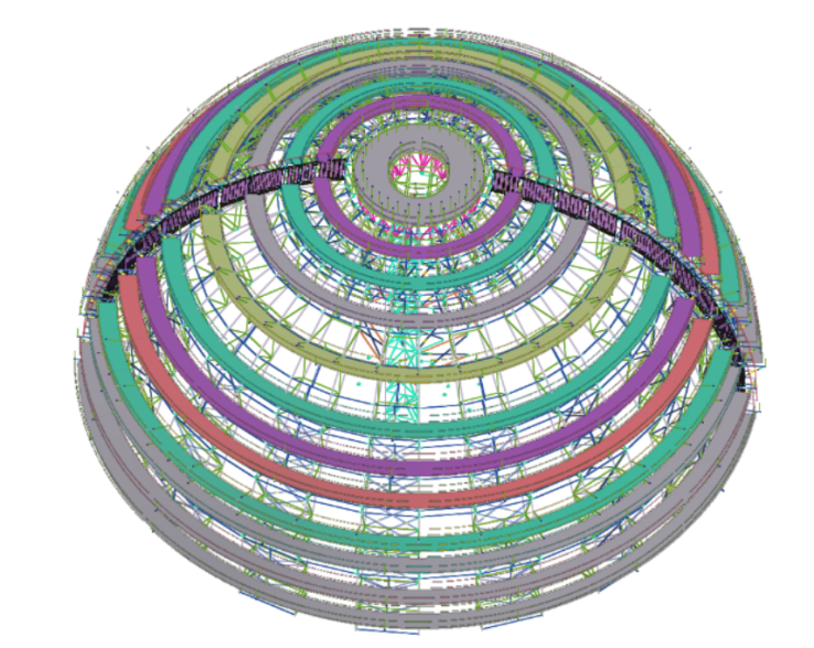 中核二二項目團隊牢固樹立“一盤棋”思想,貫徹落實中國核建“建安一體化”管理要求,統(tǒng)籌謀劃穹頂拼裝和內部安裝物項施工條件,在保證穹頂單元件拼裝尺寸精度控制同時,通過巧妙的曲面空間結構設計,達到了穹頂主體、錨固件、噴淋系統(tǒng)、通風系統(tǒng)等全部件施工需要。