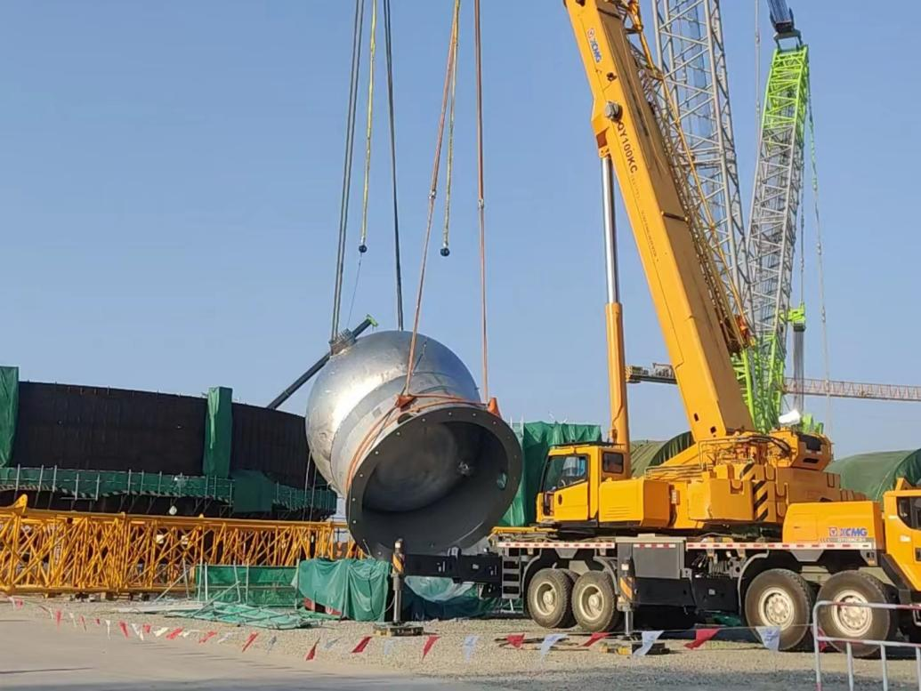 安注箱從進廠到吊裝經歷了設備倒運、開箱檢驗、索具連接、試吊及翻轉豎立、吊裝就位等多個步驟。因為體態圓胖重心難調,安注箱的翻轉作業是其中難度最大的,這需要兩臺起重機相互精準配合,同時緩慢起鉤,防止設備發生自轉與吊索具打結,設備完全豎立后溜尾起重機再松鉤最終完成翻轉作業。為確保安注箱吊裝作業順利進行,昌江核電與海南核電及各協作單位堅持全過程旁站監督,逐一核實先決條件準備情況,全面排查安全隱患點,慢工出細活做到萬無一失。