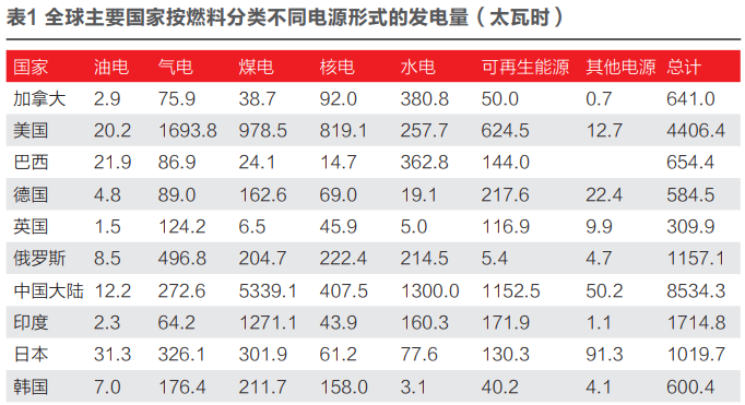 按照電源形式分類(lèi),全球重油發(fā)電為720.3太瓦時(shí),天然氣發(fā)電為6518.5太瓦時(shí),燃煤發(fā)電為10244.0太瓦時(shí),核電為2800.3太瓦時(shí),水電為4273.8太瓦時(shí),可再生能源發(fā)電為3657.2太瓦時(shí),其他電源形式為252.2太瓦時(shí)。在全球電力系統(tǒng)中,煤炭、天然氣、重油等化石燃料的發(fā)電量占比最大,為61.42%。化石燃料中石油主要以交通運(yùn)輸使用為主。