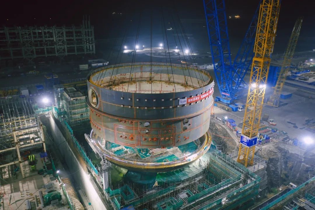 12月29日1時30分,三門核電3號機組核島鋼制安全殼(CV)筒體一環(huán)順利吊裝就位。本次吊裝的CV筒體一環(huán)直徑39.624米,高度15.554米,凈重875噸,創(chuàng)核島所有大件吊裝重量之最,為后續(xù)核島反應堆廠房各類安裝工作提供了保障。