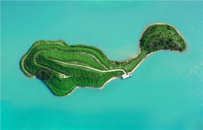 ▲陽江核電基地平堤水庫內(nèi)的湖心島覆綠后宛如一只綠“海豚”