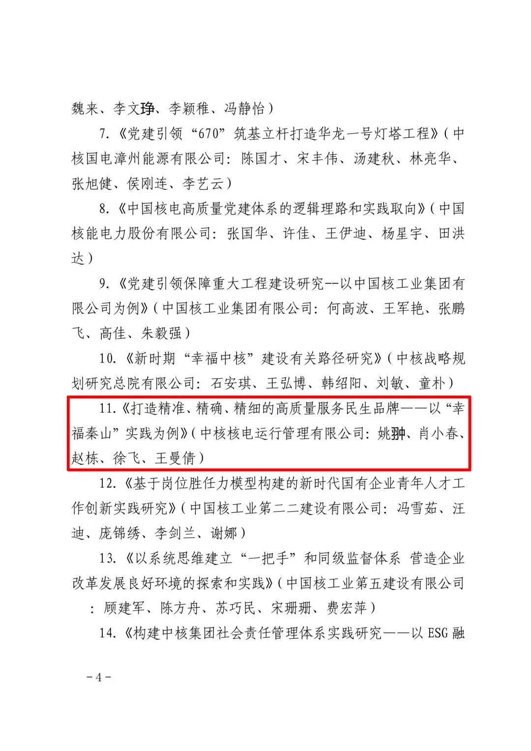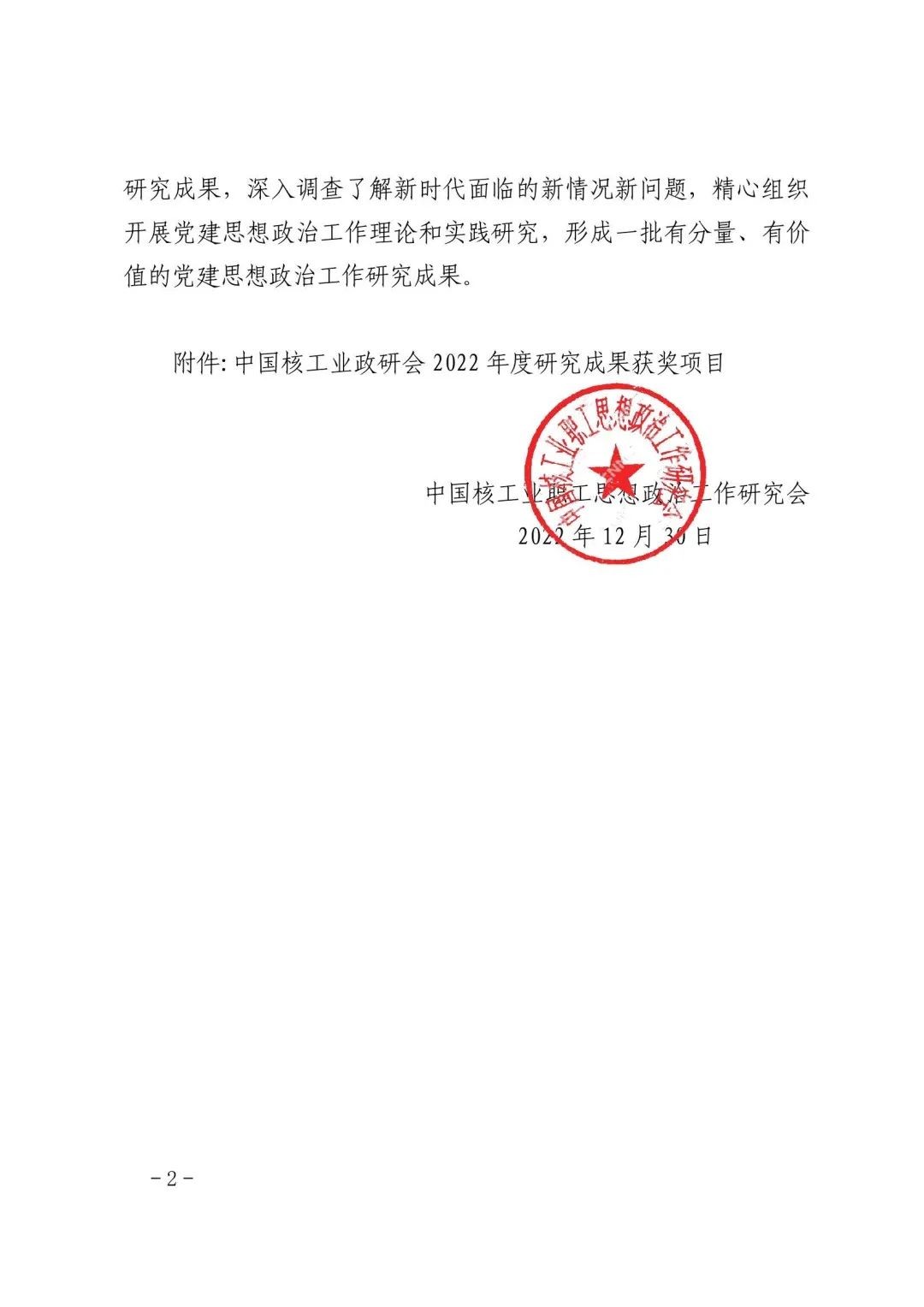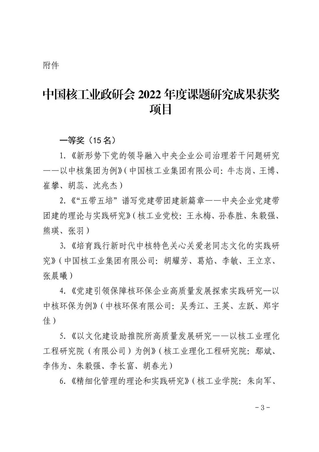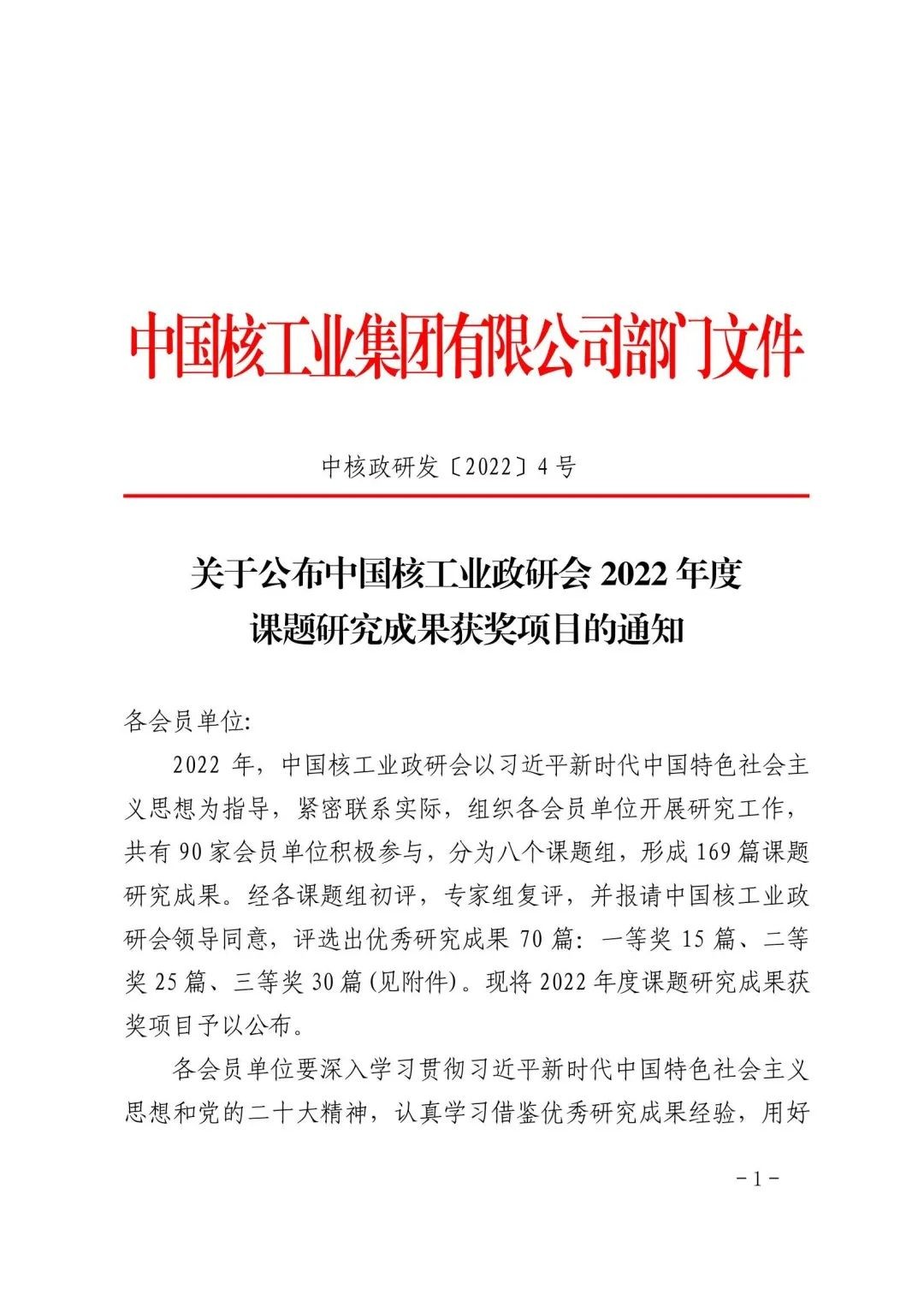日前,中國核工業(yè)思想政治工作研究會(huì)公布了2022年度課題研究成果獲獎(jiǎng)項(xiàng)目,秦山核電政研會(huì)申報(bào)立項(xiàng)的課題《打造精準(zhǔn)、精確、精細(xì)的高質(zhì)量服務(wù)民生品牌——以“幸福秦山”實(shí)踐為例》在90家會(huì)員單位推薦的169篇課題研究成果中脫穎而出,獲課題研究成果一等獎(jiǎng)。