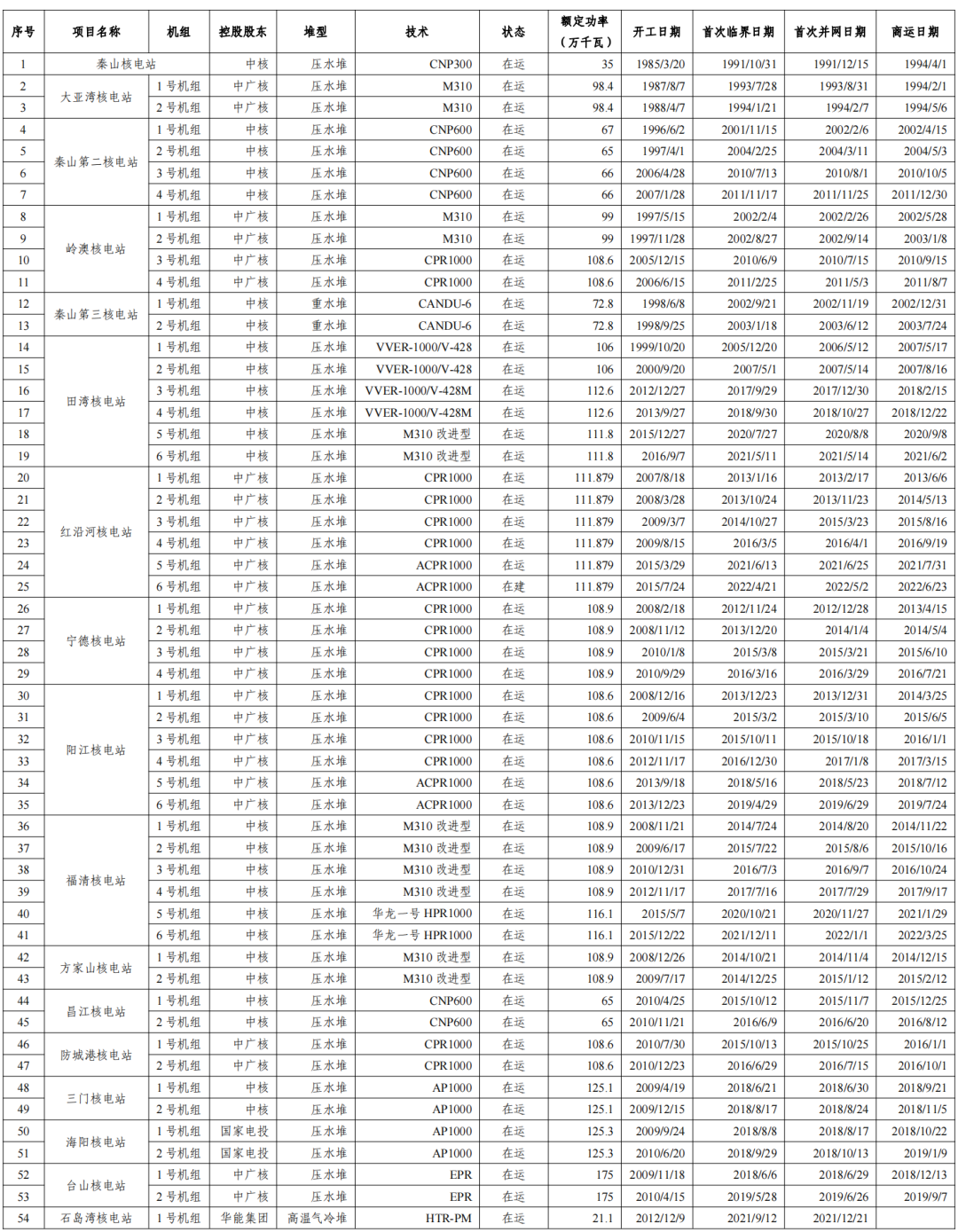 表1 我國大陸在運核電機組情況(截至2022年12月31日)