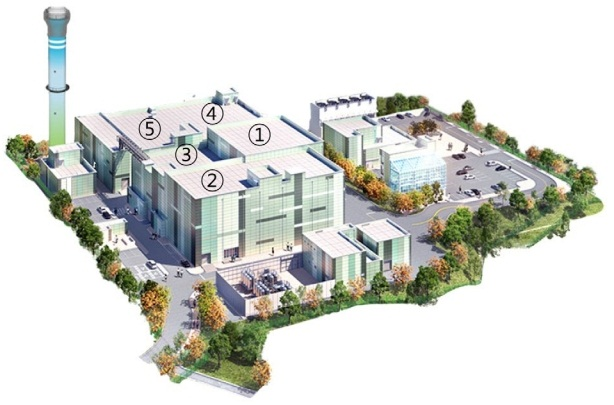 注:①反應堆廠房;②公用事業大樓;③裂變鉬生產設施(FMPF)大樓;④放射性同位素生產設施(RIPF)大樓;⑤放射性廢物處理設施(RWTF)大樓