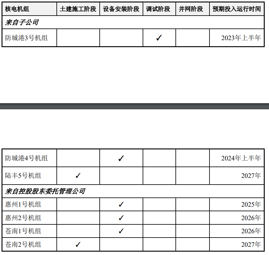 截至2022年12月31日,本集團共管理7臺在建核電機組(包括本公司控股股東委托本公司管理的在建核電機組),1臺處于調試階段,4臺處于設備安裝階段,2臺處于土建施工階段。在建機組的建設進展詳見下表: