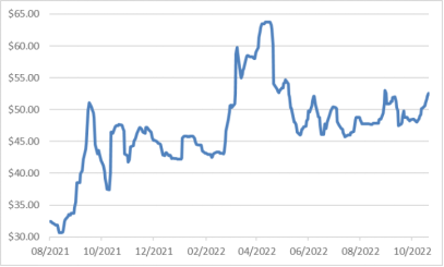 現貨鈾價變化情況(2021年8月~2022年10月)