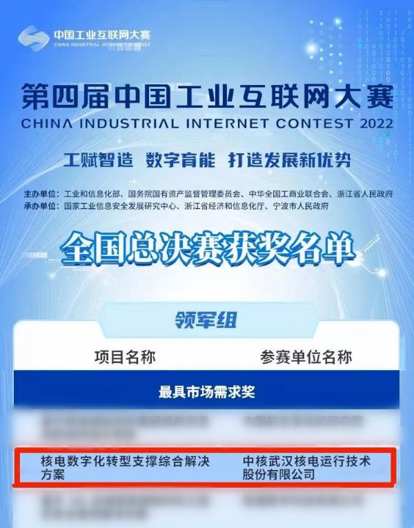 近日,第四屆中國工業(yè)互聯(lián)網(wǎng)大賽全國總決賽在寧波舉辦,中核武漢中國核電工業(yè)互聯(lián)網(wǎng)平臺大核源(DHP)項目組“數(shù)智核電”團隊榮獲【領(lǐng)軍組】“最具市場需求獎”。