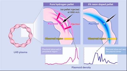 最近,使用新型激光技術的LHD系統實現了湯姆遜散射(TS)20 kHz的世界最高時間分辨率。利用這一系統,研究小組捕捉到了等離子體粒團的進化過程。他們發現,正如理論計算所預測的那樣,當氫冰摻雜約5%的氖時,等離子體粒團拋射被抑制,與注入純氫冰的情況形成鮮明對比。實驗還證實氖在等離子體的有效冷卻中起著有益的作用。