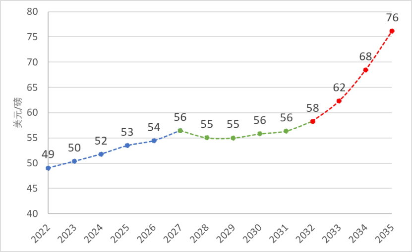 根據中國鈾業最新一期的預測(2022年下半年),天然鈾年度現貨價格在2023-2035年間將從50美元/磅上升至76美元/磅,伴隨小幅波動,但整體呈上升趨勢。