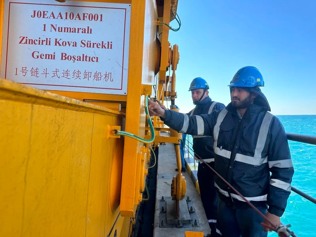 ▲上海電力土耳其胡努特魯電廠員工正檢查卸船機(jī)工作情況