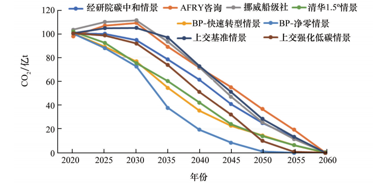圖2 8種對(duì)中國(guó)碳中和情景碳排放預(yù)測(cè)對(duì)比