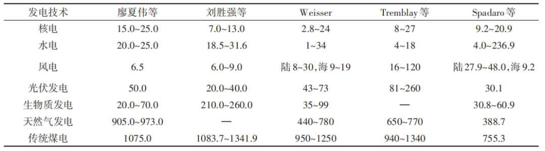 表1 不同文獻(xiàn)中全生命周期溫室氣體排放系數(shù)的比較(單位:gCO2e/kWh)