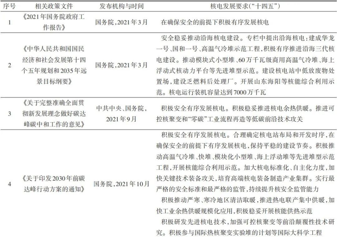 2021年以來(lái),黨中央、國(guó)務(wù)院和有關(guān)部門相關(guān)政策文件均對(duì)核能發(fā)展做出了積極、明確的部署(表2),面向2035年,核能現(xiàn)代化發(fā)展將迎來(lái)歷史性窗口期和戰(zhàn)略性機(jī)遇期。