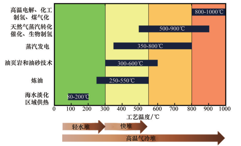 目前的壓水堆在適當(dāng)?shù)臏囟?約300℃)下產(chǎn)生熱能,通過汽輪機(jī)動(dòng)力循環(huán)將熱量轉(zhuǎn)換成電能。在先進(jìn)核反應(yīng)堆(如第四代反應(yīng)堆)中,產(chǎn)出的熱能可以達(dá)到更高的溫度(500~1000℃),這些較高的工作溫度,可以結(jié)合目前壓水堆,提供各種不同溫度和產(chǎn)量的工藝熱(圖3),并在石油化工和鋼鐵生產(chǎn)等各不同工業(yè)領(lǐng)域進(jìn)行應(yīng)用。