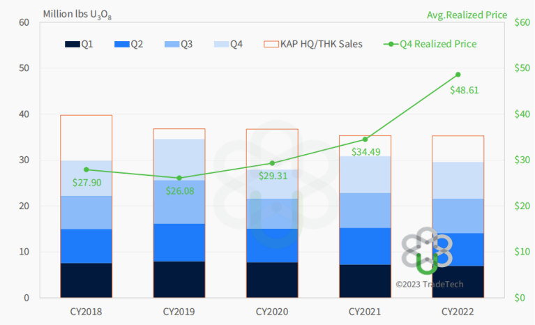 哈原工的銷量在2022年保持穩定,為13,542噸鈾(3,520萬磅U3O8),平均銷售價格為42.51美元/磅U3O8,相比2021年增長31%。第四季度銷售總量為1,340噸鈾(350萬磅U3O8),平均銷售價格為48.61美元/磅U3O8。