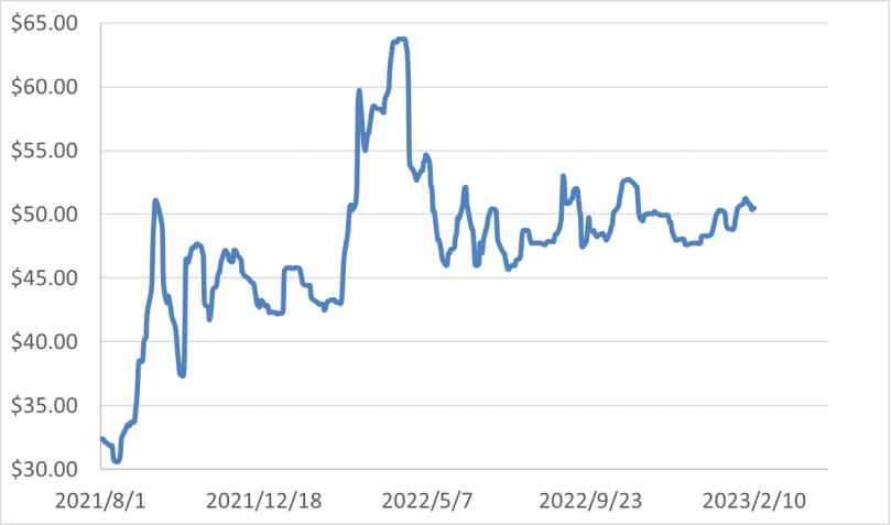 2020年1月-2023年1月末現貨鈾價和長貿鈾價