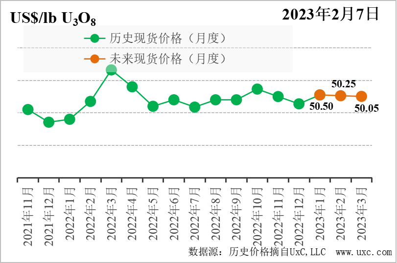 回顧1月,整個市場活躍度不高,天然鈾價格在50.00美元/磅左右波動。1月初的天然鈾價格為48.00美元/磅,1月9日至1月12日,市場出現(xiàn)少量交易,價格被推高并維持至50.25美元/磅。1月18日,天然鈾價格跌回49.00美元,并在此價位維持一周。1月的最后一周,美聯(lián)儲官員透露加息幅度將減弱,美股整體反彈,SPUT股價上漲觸發(fā)其入場采購,天然鈾價格顯著提升,月底天然鈾價格收于51.25美元/磅。