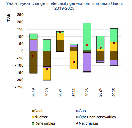 根據(jù)國際能源署預(yù)測,隨著能源價格降低和電氣化的進一步推進,歐洲地區(qū)電力需求量從2023年開始將以年均1.4%的速度增長。同時國際能源署認(rèn)為,歐盟目前的碳排放量增長是暫時的,預(yù)計到2025年,歐洲的發(fā)電相關(guān)碳排放量平均每年將減少約10%。隨著可再生能源發(fā)電量和核發(fā)電量的增加,歐洲煤炭和天然氣發(fā)電量將會大幅下降,降幅分別為年均10%和12%。