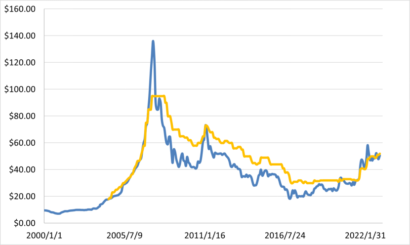 2020年1月-2023年1月末現貨鈾價和長貿鈾價
