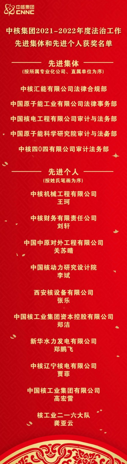 會上,中核集團總法律顧問、首席合規官李朝暉傳達了中央企業深化法治建設加強合規管理工作會議精神并作了法治工作報告。審計與法務部宣讀了表彰2021-2022年度集團公司法治工作先進集體與先進個人的通知,報告了集團公司第一輪內控監督評價三年全覆蓋工作情況。新華發電、中核匯能、中核五公司等十家單位進行了法治工作經驗分享。
