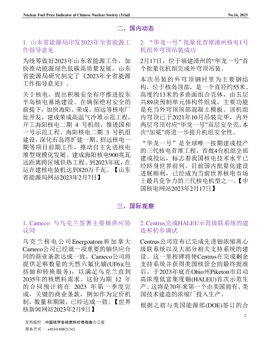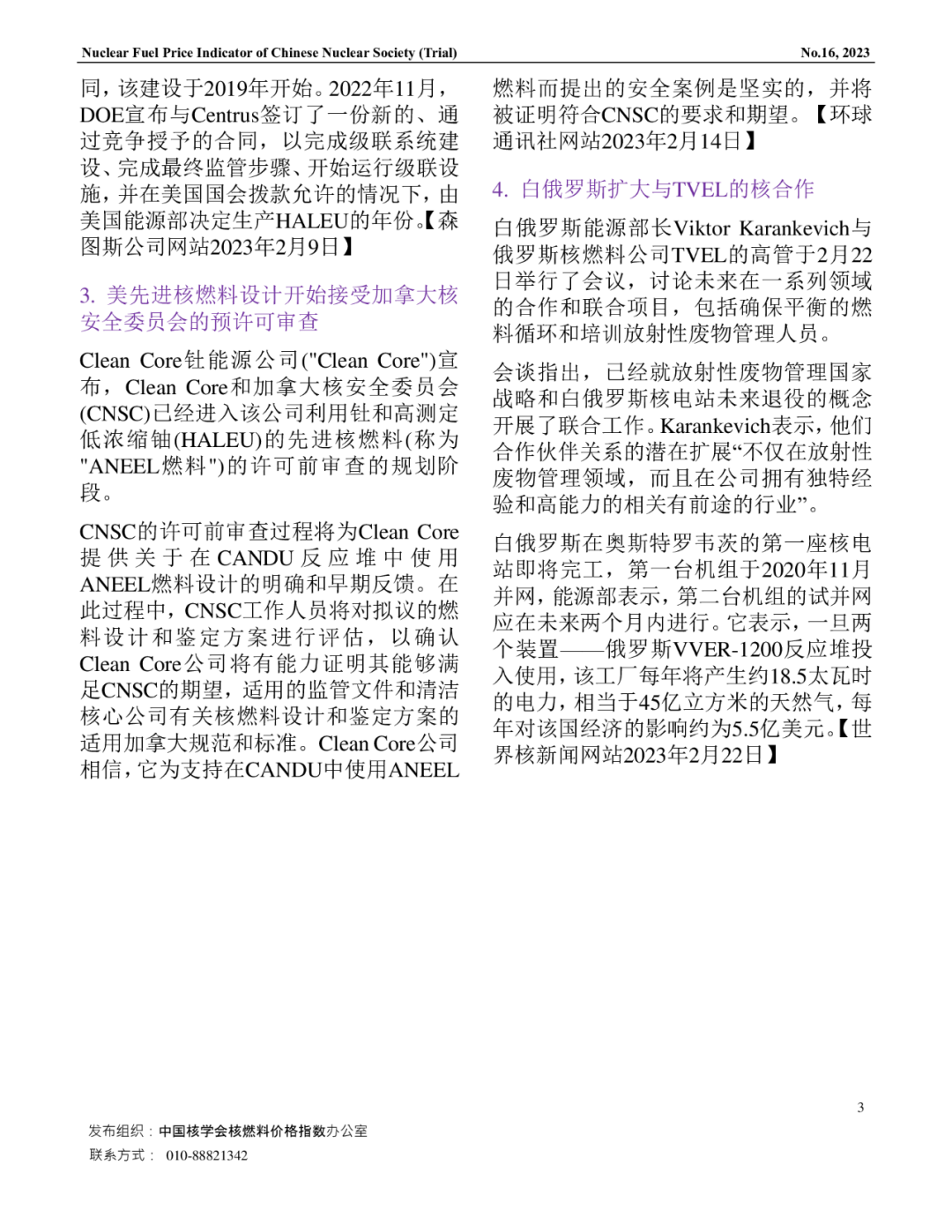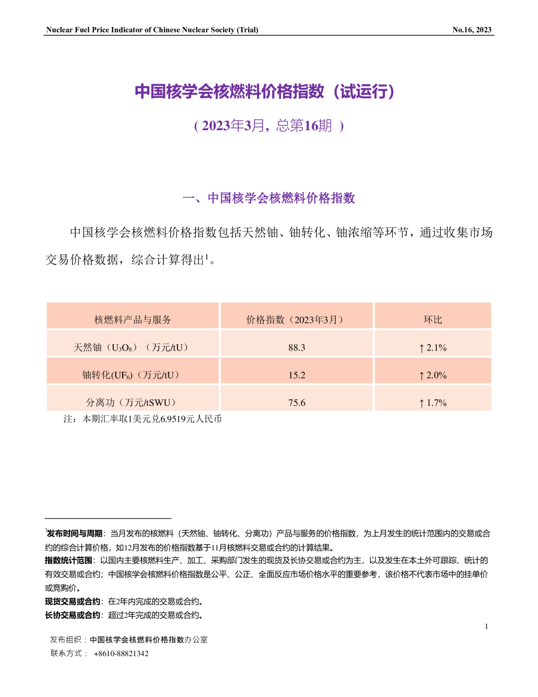 中國核學會核燃料價格指數(試運行) ( 2023年3月, 總第16期 )